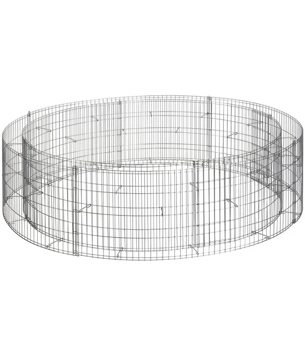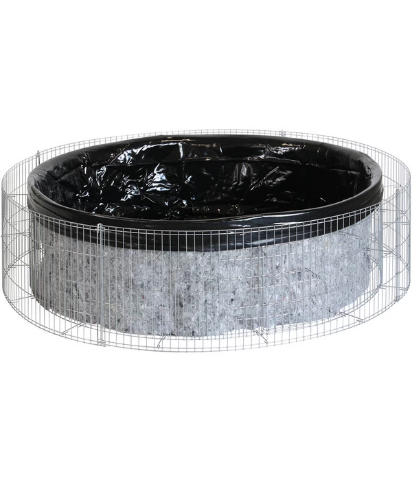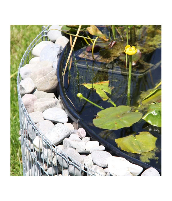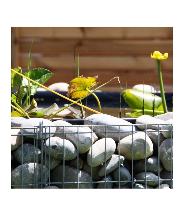 Der bellissa Hochteich Bausatz ist geeignet für einen individuell bepflanzbaren Hochteich in Gabionenform. Auch bei dieser Gabione erfolgt der Aufbau ohne Verschrauben – alle Verbindungen sind Steckverbindungen. Individuell gestalten lässt sich die Gabione durch unterschiedliche Materialien wie Holz, Baumrinde oder Steine. Im Lieferumfang sind eine Folieneinlage sowie ein Trennvlies enthalten. Letzteres dient dem Schutz der Folie vor allzu spitzen Steinen. Aus verzinktem Stahldraht bestehend, sind die Gitter vor Witterungseinflüssen geschützt. Die Füllmenge des Bassins beträgt ungefähr 490 Liter. Steine, Erde und Pflanzen werden im bellissa Hochteich Bausatz nicht mitgeliefert. Im Durchmesser misst der Gabionenteich außen 146 Zentimeter und innen 126 Zentimeter, die Maschen des Gitters haben die Maße 2,5 mal 10 Zentimeter.