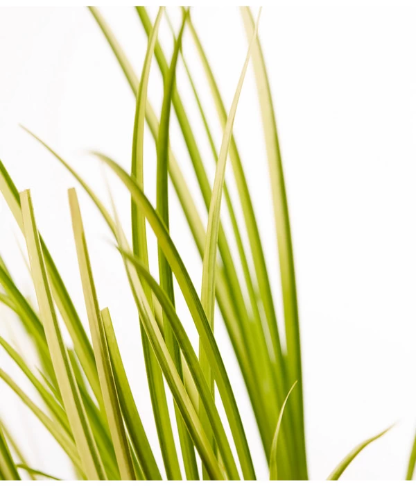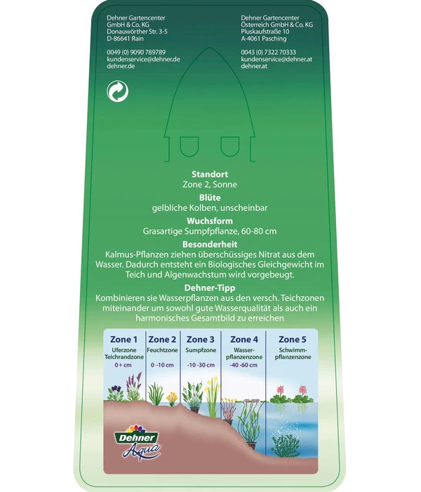 Ein schlanker Wuchs und ein interessant gemustertes Kleid machen diese Gartenpflanze zu einem Hingucker im Garten. Ursprünglich ist sie in den gemäßigten bis subtropischen Gebieten Asiens sowie in Nordamerika und Südostasien heimisch. Bei uns ist der Kalmus seit dem Mittelalter bekannt und besiedelt inzwischen verwildert feuchte Gräben, das Ufer von Teichen, Bächen und langsam wachsenden Flüssen sowie Sumpfgebiete. Die streng aufrecht wachsenden, schilfartigen Blätter der Kalmuspflanze von Dehner erreichen ein Wuchshöhe von ca. 35 cm und sind mit der weißgrünen Färbung und dem aromatischen Duft der Blätter ein toller Schmuck für viele Gartenanlagen. Im Juni und Juli bildet der Kalmus von Dehner bräunliche Blütenkolben aus, die aber eher unscheinbar sind. Gärtner schätzen die Pflanze als grasartigen Blattschmuck für feuchte Gartenbereiche. Optimal gedeiht die Pflanze im Uferbereich eines Gartenteichs, sie kann aber auch Beete und Kübel dekorativ beleben.