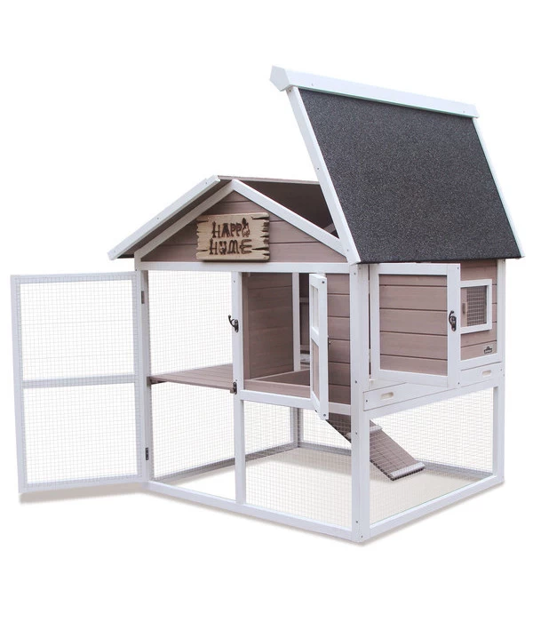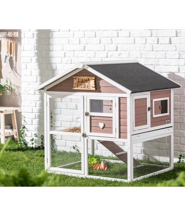 Kaninchenstall auf 2 Etagen, inkl. Freigehege & Rückzugsmöglichkeit, aus Tannenholz, wasserdichtes, aufklappbares Bitumen-Dach