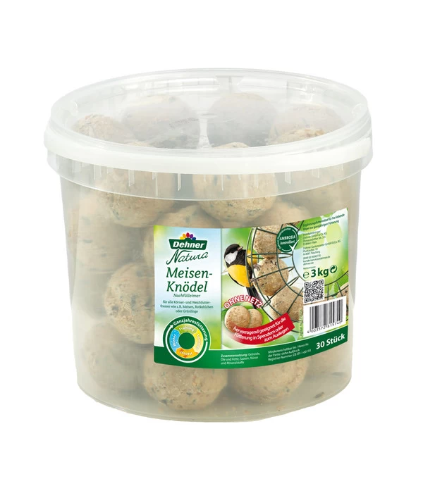 Das Füttern der gefiederten Freunde in unseren Gärten hat eine lange Tradition, jedenfalls im Winter. Man hilft den kleinen Kerlchen über die kalten Tage mit energiereichem Futter und kann ihr munteres Treiben ganz aus der Nähe beobachten. Eine wunderbares Naturerlebnis für große und kleine Vogelfreunde. Inzwischen bestätigen aber auch viele Wissenschaftler, dass eine artgerechte Fütterung das ganze Jahr sinnvoll ist. Vielleicht haben auch Sie schon in Ihrem Garten beobachtet, dass die Vögel früher brüten und mehr Junge überleben, seit Sie Ihren Freunden das ganze Jahr ein hochwertiges Futter wie die Dehner Natura Meisen-Knödel ohne Netz anbieten. Da werden Sie es begrüßen, dass wir Ihnen jetzt die beliebten Knödel im praktischen Vorratseimer anbieten. Nehmen Sie diese Gelegenheit gleich wahr und besorgen Sie sich die Dehner Natura Meisen-Knödel ohne Netz. Mit einer stattlichen Größe von 100 g je Knödel können Sie viele liebenswerte Piepmätze in Ihrem Garten satt und glücklich machen.