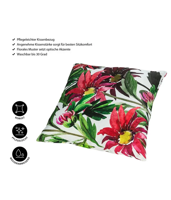 Die Sonne scheint und Sie möchten es sich draußen bequem machen. Haben Sie dabei schon an gemütliche Kissen gedacht? Eine hervorragende Wahl für Ihre Wohlfühloase draußen ist das Dehner Outdoorkissen Lea in bewährter Dehner Markenqualität. Angenehm weich gepolstert und wunderbar bauschig erweist sich das Accessoire als perfekter Kuschelpartner. Auch als Kopfunterlage für ein entspanntes Nickerchen oder einfach nur als stilvoller Dekogegenstand eignet es sich sehr gut. Mit dem farbenfrohen floralen Print zaubert das Outdoorkissen Lea eine tolle Stimmung in Ihren Außenbereich. Nicht nur Blumenfans, sondern alle, die schöne Deko lieben, kommen bei diesem Design voll auf ihre Kosten.