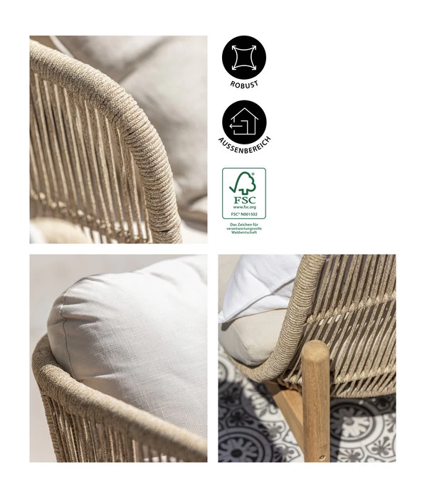 Sie verbringen Ihre Freizeit am liebsten auf der Terrasse oder auf Ihrem Balkon? Damit es draußen genauso gemütlich ist wie im Haus, gibt es bei Dehner das 2-Sitzer-Sofa Portofino. Mit diesem stylishen Sitzmöbel wird das Relaxen noch einmal so schön. Die edle Geflecht-Optik sorgt für ein exotisches Flair, welches von der naturnahen Farbgebung wirkungsvoll unterstützt wird. Genießen Sie die Zeit unter freiem Himmel auf den komfortablen Sitz- und Rückenpolstern, die mit robustem Leinen-Stoff bezogen sind. Die Verwendung dieses strapazierfähigen, langlebigen Gewebes wird zudem dem Nachhaltigkeitsgedanken gerecht, genauso wie das stabile Gestell aus FSC-zertifizierten Teakholz. Laden Sie Ihre Freunde zu einer stimmungsvollen Gartenparty ein und unterstreichen Sie mit dem Outdoor-Sofa Portofino Ihren exquisiten Geschmack.