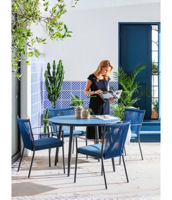 Im gleichen schwarz/blauen Design wie der Dehner Tisch ‘Delphi‘ haben wir auch Stühle für Sie kreiert, mit denen Sie den modisch frischen Look auf Ihrer Terrasse perfekt machen können. Der Stapelstuhl begeistert außerdem mit einer Rückenverarbeitung aus dekorativen Schnüren, die den Stuhl leicht transparent wirken lassen und beim Anlehnen mit ihrer leichten Elastizität verwöhnen.