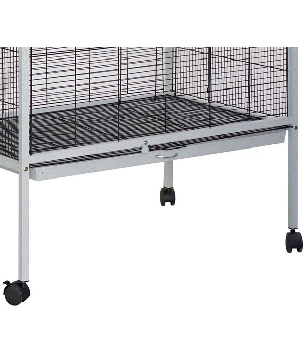 Sie erhalten die Vogelvoliere in hoher Markenqualität aus dem Hause Dehner. Dementsprechend überzeugt das Produkt durch ein hervorragendes Design und praktisches Equipment. Die Schublade der Voliere lässt sich ganz leicht ausziehen, um eine schnelle sowie gründliche Reinigung zu ermöglichen. Außerdem sind Sitzstangen und Näpfe bereits dabei, damit die angenehme Zeit für Ihre gefiederten Freunde sofort beginnen kann. Dank zwei großer Türen können alle Elemente zudem komfortabel erreicht werden. Wenn Sie die Voliere hingegen in der Position verändern möchten, ist dies spielend leicht möglich, da sie mit vier Rollen ausgestattet wurde. Entscheiden Sie sich jetzt für die Dehner Vogelvoliere Hammer Blow und bieten Sie Ihren Ziervögeln nur das Beste!