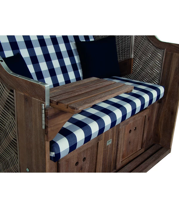 Der Strandkorb Greenline 35 hat ein stabiles Gestell aus FSC®-zertifiziertem Akazienholz, das dekorative Geflecht an den Seiten besteht aus wetterfestem Kunststoff. Auch für die Polster, die Kopfstützen und die Kuschelkissen wurde eine hochwertige, sehr strapazierfähige Materialqualität – Polyester – gewählt. Die Kissen können Sie sogar herausnehmen und per Hand waschen. Ein besonderes Extra sind die beiden metallgefassten Bullaugen, die Ihnen den Blick in Ihren schönen Garten erlauben.