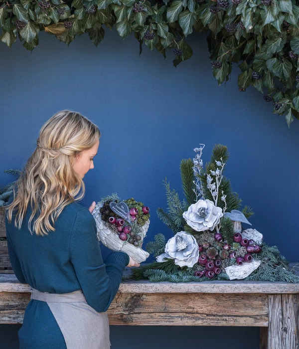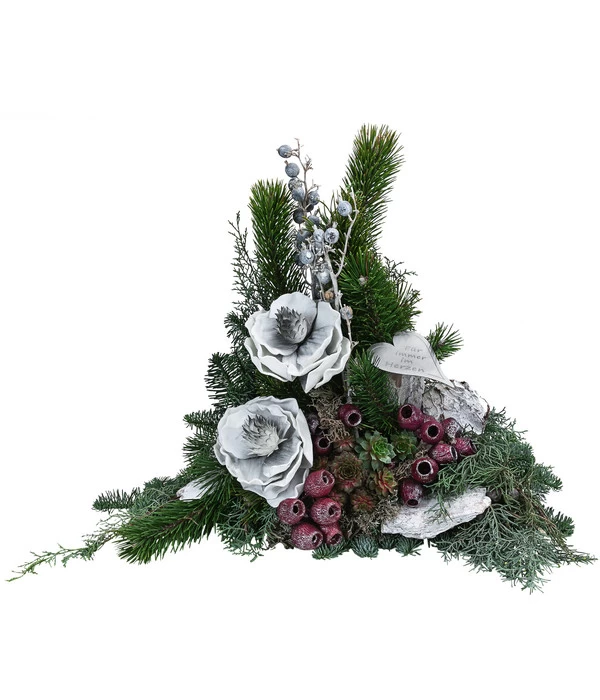 Bei diesem Grabgesteck bilden üppige Zweige der Nobilistanne, die nicht ohne Grund als Edeltanne bezeichnet wird, die dunkelgrüne Basis für weitere natürliche Deko-Elemente. Da gesellen sich verschiedene Koniferenzweige in anderen Grünnuancen dazu, begleitet von Eukalyptus-Glocken, Beerenzweigen oder geweißter Rinde, die aussehen, als hätte der erste Schnee sie gerade frisch bezuckert. Den dekorativen Mittelpunkt aber bilden die wunderschönen Deko-Blüten in Weiß, die der Kreation eine exklusive Note verleihen. Noch ein Tipp: Bringen Sie mit einer Grablampe Licht in dunkle Winternächte. Bei Dehner finden Sie eine große Auswahl verschiedener Grablichter, auch eine LED-Grablampe, die eine kleine Solarzelle hat und die letzte Ruhestätte und das Grabgesteck bei Nacht mit einem warmen Lichtschein beleuchten wird.