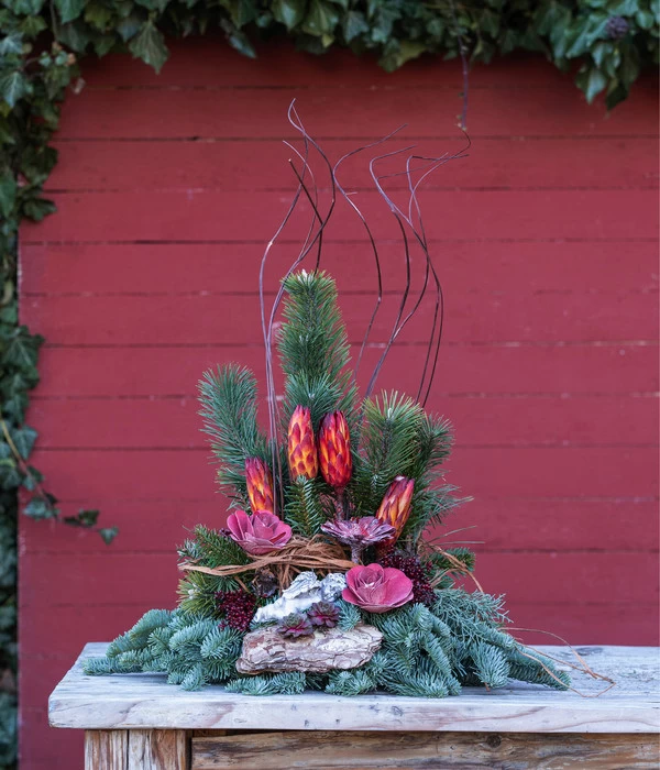 Dank der stattlichen Maße von 60 cm Breite und 80 cm Höhe können Sie mit dem Grabgesteck In Liebe sowohl Einzelgräber wie auch größere Familiengrabstätten stilvoll schmücken. Auf einem üppigen Bett aus Koniferen-Zweigen wurden dekorative Naturmaterialien geschmackvoll arrangiert, den stimmungsvollen Höhepunkt aber bilden natürlich die beiden Rosenblüten aus Holz als dem wohl schönsten Symbol ewiger Liebe und die kleine Engelsfigur aus Kunststein, die über die letzte Ruhestätte Ihrer Lieben wacht.