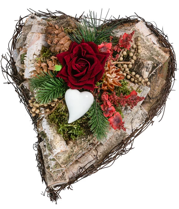 Das Herz Sören ziert prominent eine künstliche rote Rosenblüte, die wie keine andere Blume als Symbol der Liebe zu verstehen ist. Künstliche Beerenzweige, Zapfen, Moos und Efeu runden das harmonische Bild ab und insgesamt punktet das Trauerherz mit seiner naturnahen Optik trotz haltbarer Elemente. Unsere Floristen haben dieses Grabgesteck liebevoll per Hand für Sie zusammengestellt und darin viele Symbole der Zuneigung und Liebe verarbeitet, wie beispielsweise das weiße Keramikherz. Daher eignet sich das dauerhaft schöne Herz Sören natürlich als winterliche Grabdekoration und passt dank der Größe auch zu Urnengräbern und kleineren Grabstätten.
