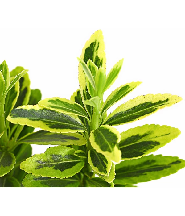 Ein lebendiges Bild aus grüngelben Farbnuancen entfaltet sich vor Ihrem Auge, wenn ein Kleinblättriger Kriech-Spindelstrauch ‘Microphyllus Aureovariegatus‘ auf einem Beet oder in einem Kübel in Ihrer grünen Oase Platz nehmen darf. Oder auch mehrere Pflanzen, denn der ursprünglich aus Japan und Korea stammende Kleinstrauch entfaltet seinen Reiz besonders gern in Gesellschaft. Mit seinem kompakten Wuchs und der geringen Wuchshöhe von maximal 30 cm hat er sich hier in unseren Gärten und Parks in erster Linie als unkomplizierter Bodendecker beliebt gemacht. Besonders eindrucksvoll strahlt das dekorativ gemusterte Blattkleid, wenn Sonnenstrahlen darauf fallen und die gelben Elemente wie pures Gold leuchten. Was der Namengeber schon mit dem Zusatz Aureo angedeutet hat, denn ein Aureus war eine der wertvollsten Goldmünzen im römischen Reich. Holen auch Sie sich mit dem Kleinblättrigen Kriech-Spindelstrauch ‘Microphyllus Aureovariegatus‘ einen wertvollen Kleinstrauch, der neben dem spektakulären Blattschmuck im Juni und Juli auch kleine weiße Blüten präsentiert, die dann im Herbst als rosafarbene Früchte zwischen dem Laub leuchten.