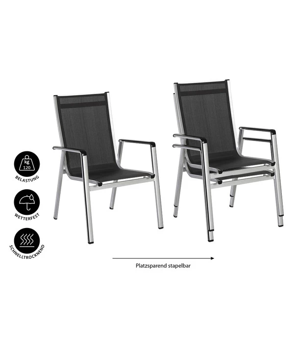 Wenn Sie an schönen Sommertagen viele Stunden in Ihrem MWH Alu-Stapelsessel Elements verbringen und sich jede Minute wohl in ihm fühlen; wenn Ihre Freunde jedes Mal aufs Neue von der modernen Optik des MWH Alu-Stapelsessel Elements beeindruckt sind, ist das eindeutig ein Kompliment für diesen Gartenstuhl. Und für den Designer. Und für Sie, die sich für den MWH Alu-Stapelsessel Elements entschieden haben. Und es war in der Tat eine gute Entscheidung! Denn der MWH Alu-Stapelsessel Elements erfüllt alle Ansprüche mit Bravour, die heutzutage an Gartensessel gestellt werden. Die modern schlichte Optik ist absolut zeitgemäß und fügt sich perfekt ins jedes Gartenambiente ein, die Farbkombination aus glänzenden Alu und anthrazitfarbenem Bezug verleiht dem MWH Stapelsessel Elements die elegante Note. Der Material-Mix aus wunderbar leichtem und doch stabilem Aluminium und innovativen Kunststoffgewebe sorgen für die Wetterfestigkeit und Strapazierfähigkeit, gepaart mit einer hervorragendem Sitzkomfort. Und am Ende der Sommersaison können Sie den MWH Alu-Stapelsessel Elements platzsparend übereinander stapeln.