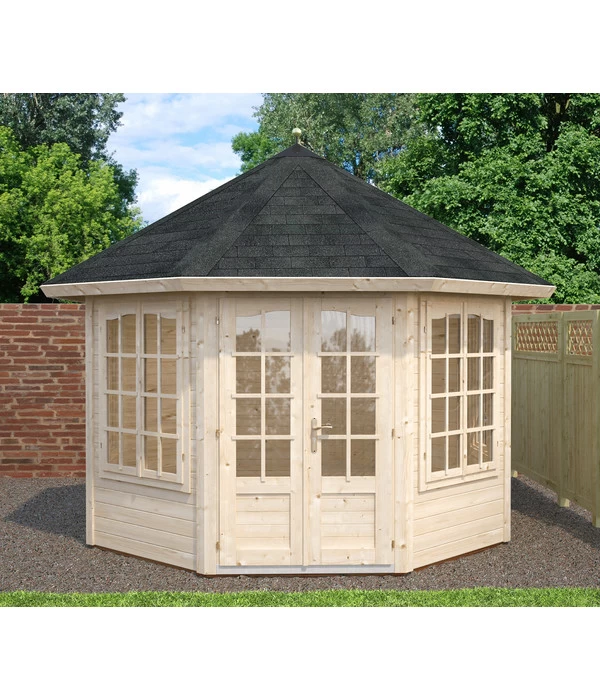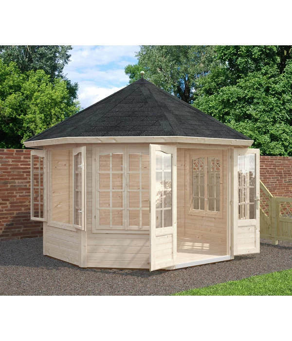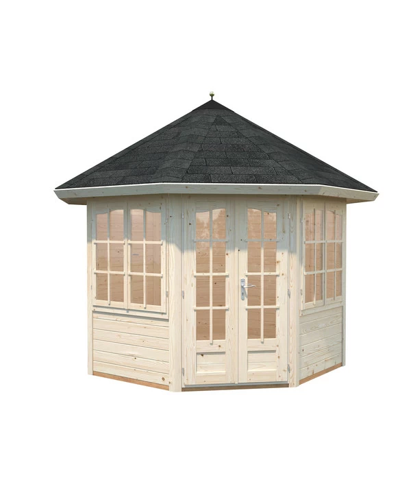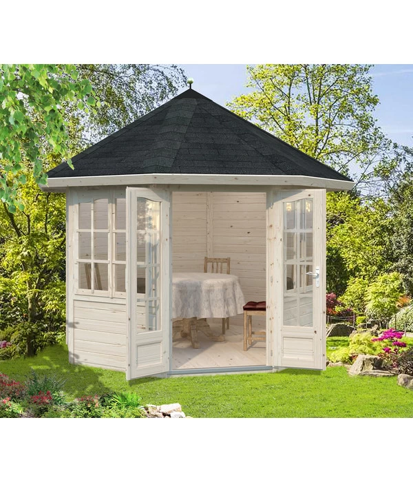 Sie lieben Ihren Garten und möchten ihn mit einem romantischen, kleinen Rückzugsort verschönern? Dann ist der Pavillon Veronika von Palmako genau die richtige Wahl. Die anmutige Silhouette des Holzpavillons aus nordischem Fichtenholz verschönert Ihren Garten und bietet zusätzlich viel Komfort: Dach- und Fußbodenbretter bestehen aus robustem Leimholz, zwei große Doppelfenster sorgen für helles Tageslicht im Innenraum. Ihr Garten wird mit dem Pavillon in ein Wohnzimmer verwandelt, das Sie auch bei regnerischem Wetter genießen können. Und dennoch bleibt das Flair des Besonderen erhalten, denn Sie sitzen eben nicht im Haus, sondern in Ihrem blühenden Garten. Entspannten Stunden bei Kaffee und Kuchen mit den Liebsten steht so auch bei schlechter Witterung nichts mehr im Wege.