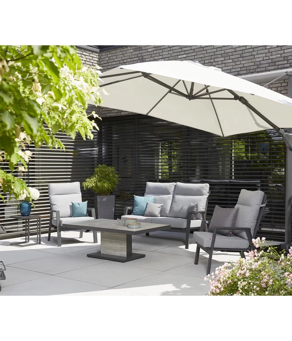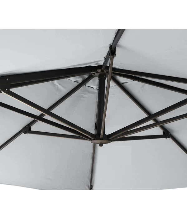 Der Schirm, der auf dem stabilen, wetterfesten Mast des Siena Garden Ampelschirm Sunset N+ schwebt, besteht aus einer besonders hochwertigen, dichtgewebten Polyester-Qualität (300g/m²), die Ihnen einen ausgezeichneten UV-Schutz von 50+ bietet. Zusätzlich wurde der Stoff mit Polyurethan beschichtet, sodass die Schirmfläche wasserabweisend ist. Das Aufspannen des großen Schirms gelingt dabei leicht mit einer robusten Aluminiumgusskurbel, vertikal kippen können Sie ihn über einen handlichen Schiebegriff. Das horizontale Kippen erfolgt durch einen Hebel. Die selbstspannenden Streben sorgen immer für einen faltenfreien und gleichmäßig gespannten Bezug.