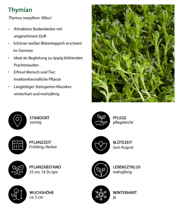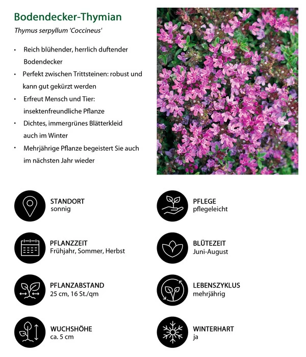 Das Staudenset Duftender Thymian hat eigentlich nur zwei Wünsche an Sie: einen sonnigen bis halbschattigen Standort in einem durchlässigen und gerne trockenen Boden. Erfüllen Sie den Pflanzen diese Wünsche, werden sie fast von allein viele Jahren Ihren Garten schmücken. Sie brauchen kein Wasser und keine Düngegaben und auch keinen Rückschnitt im Herbst. Und natürlich ist der pflegeleichte Bodendecker auch winterhart.
