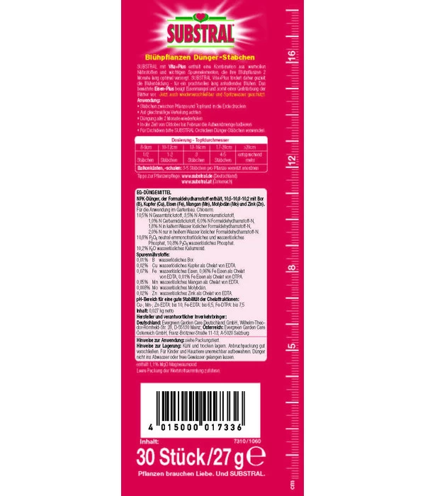 Die Substral® Dünger-Stäbchen versorgen Ihre Blühpflanzen nicht nur mit wichtigen Nährstoffen, sondern sind auch wunderbar komfortabel in der Anwendung. Drücken Sie die Substral® Blühpflanzen Dünger-Stäbchen einfach zwischen Pflanze und Topfrand in die Erde – fertigt. Durch das regelmäßige Gießen werden die Wirkstoffe dann so nach und nach gelöst und den Pflanzen zur Verfügung gestellt. Da die Düngestäbchen eine Wirkungsdauer von 2 Monate haben, braucht die Anwendung auch nur alle 2 Monate wiederholt zu werden. Bei größeren Pflanzen mit größeren Pflanzgefäßen müssen Sie natürlich die Menge Stäbchen erhöhen. In den Monaten Oktober bis Februar wird die Menge der Substral® Blühpflanzen Dünger-Stäbchen in der Regel halbiert.