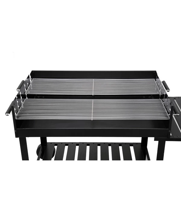 Eine knusprige Bratwurst oder ein leckeres Steak ist zweifellos ein besonderer Genuss: Nicht umsonst erfreut sich das Barbecue als Zubereitungsmethode für Fleisch, Fisch und Co. in Deutschland einer großen Beliebtheit. Wer dabei auch in Sachen Qualität nichts dem Zufall überlassen möchte, ist mit dem tepro Holzkohle-Grillwagen Atlanta genau richtig bedient. Gleich zwei verchromte Grillroste mit den Maßen 98 x 28 cm fungieren hier als Ablagefläche für das gewünschte Grillgut. Dank der Möglichkeit, beide Roste in der Höhe zu verstellen, behalten Sie jederzeit die volle Kontrolle über die genaue Grilltemperatur. Je nach Bedarf variiert die Arbeitshöhe des tepro Holzkohle-Grillwagens somit zwischen angenehmen 77 und 88 cm. Auf den lackierten Boden und Seitenablagen bereiten Sie zudem Salate und Beilagen direkt am Grill vor, alternativ lagern Sie hier Ihr Lieblingsfleisch bis zur Zubereitung auf dem Grill auf komfortable Art und Weise. Getragen wird das hochwertige Gerät von vier lackierten Beinen, wovon zwei mit Kunststoffrädern ausgestattet sind. Der tepro Holzkohle-Grillwagen Atlanta verfügt außerdem über ein außerordentlich hohes Kohlefassungsvermögen von maximal 5,0 Kilogramm.