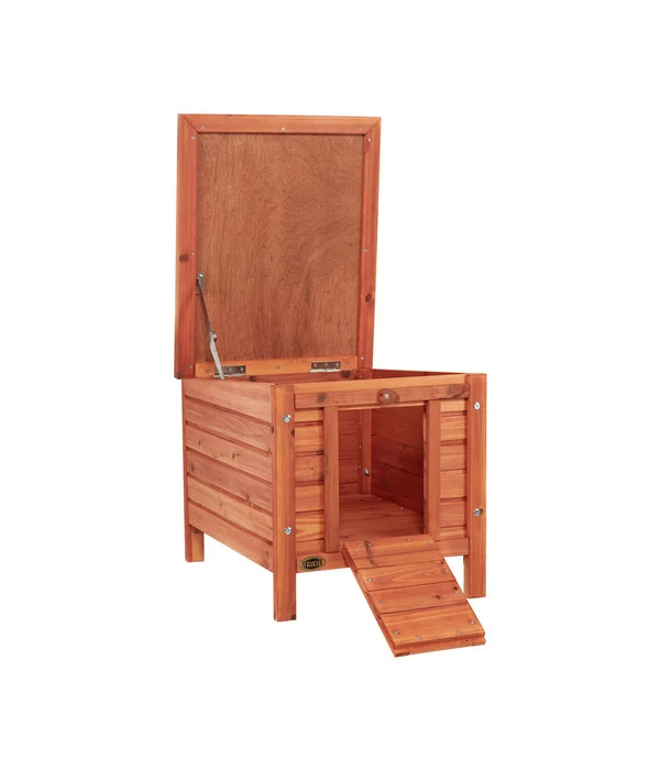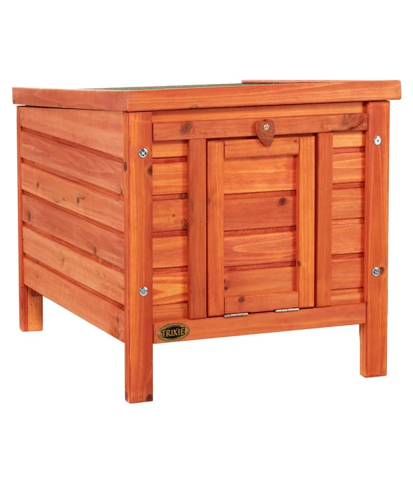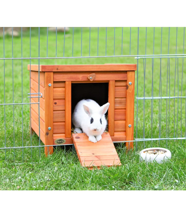 Das Nagerhaus ist eine ideale Erweiterung für den Kaninchenstall oder das Außengehege. Das Haus für Kaninchen & Co. besteht aus lasiertem Kiefernholz und hat an der Front eine aufklappbare Tür. Das mit besandeter Dachpappe versehene, wetterbeständige Dach lässt sich aufklappen, so dass Sie das Nagerheim einfach von oben reinigen und mit Einstreu befüllen können – zur Fixierung des Dachs gibt es einen seitlichen Haken. Um Ihren kleinen Liebling vor Bodenfeuchtigkeit und -kälte zu schützen, steht das Häuschen für Kaninchen und Nager auf Füßen. So wird auch eine gute Luftzirkulation gewährleistet.