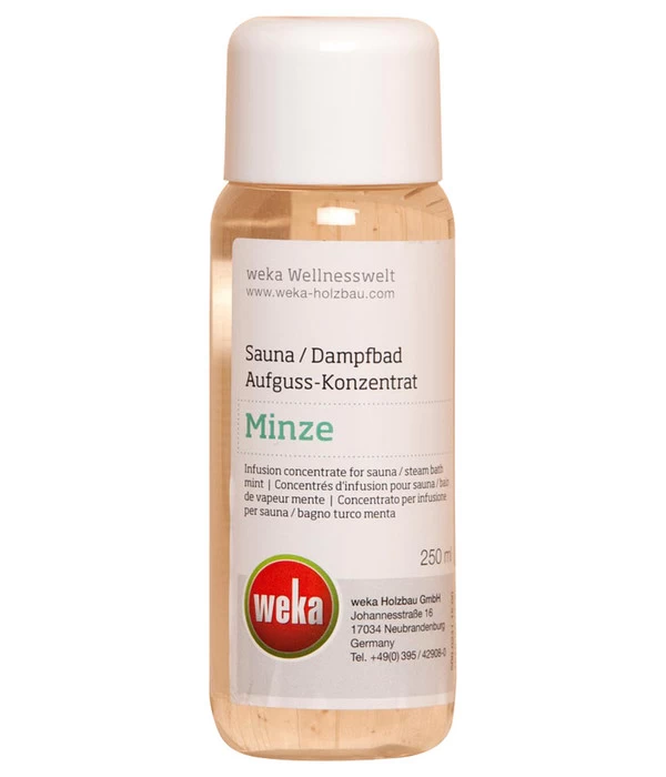 Mögen Sie es, Zeit in Ihrem anregenden Dampfbad zu verbringen oder in Ihrer Sauna angenehm zu schwitzen? Möchten Sie dabei einen frischen Duft einatmen können, der Ihnen sinnliche Wellnessmomente beschert? Dann verwenden Sie beim nächsten Mal doch den herrlichen Saunaduft Minze von Weka als Aufguss. Wodurch überzeugt dieser auserlesene Duft? Einerseits wirkt er äußerst belebend, sodass Sie sich rasch erholen. Andererseits verwöhnt er Sie und Ihren Körper aufgrund der enthaltenen ätherischen Öle. Wie wirken sich diese wertvollen Bestandteile auf Ihr Wohlbefinden aus? Die Öle fördern zum einen die Durchblutung und haben daher eine stimulierende Wirkung. Zum anderen erfrischen sie Ihre Atemwege, damit Sie ausreichend Luft durch Ihren Körper strömen lassen. Lassen Sie es sich gut gehen und verbringen Sie dank des Minze-Dufts behagliche Stunden.