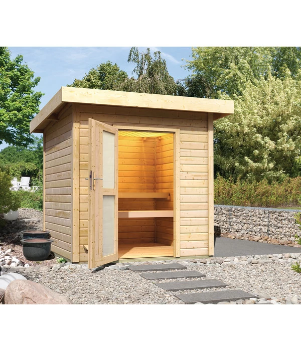 Schick, kompakt, hochwertig – so stellen Sie sich Ihre zukünftige Outdoor-Sauna vor. Denn Sie wissen, dass es gerade für kleinere Gärten äußerst attraktive Lösungen gibt. Das Finnhaus Saunahaus Basic Lenja 40 ist der schönste Beweis dafür. Denn der topmoderne, kubische Holzbau bietet Ihnen auf kleinstem Raum Saunavergnügen pur. Und das wird Ihnen auch in puncto Gartengestaltung jeden Tag Freude bereiten. Denn der schlichte Kubus mit dem prominenten Pultdach und der unverkennbaren Sauna-Ausstrahlung des naturbelassenen Holzes wird zum Blickfang, der Ihrem Garten den Charakter eines privaten Wellness-Ressorts verleiht. Mit allen Sinnen genießen werden Sie es natürlich auch von innen, wo Sie von hitzig duftendem, naturbelassenem Holz umgeben sind. Ihren Platz wählen auf einer der beiden unterschiedlich hoch angebrachten Espenholzbänke, die sich auch ideal für das Saunieren zu zweit eignen. Am besten, Sie legen schon bald den ersten Saunatermin im Finnhaus Saunahaus Basic Lenja 40 mit Ihrem Partner fest!